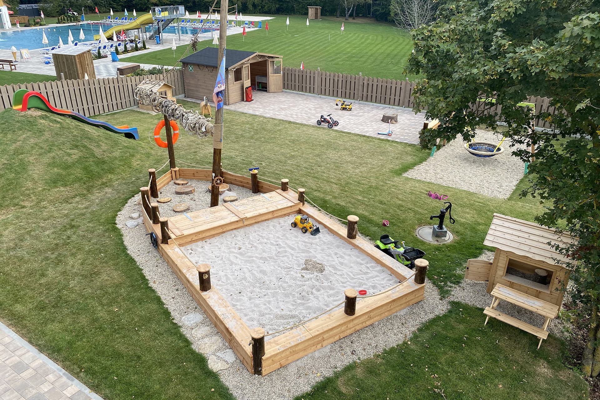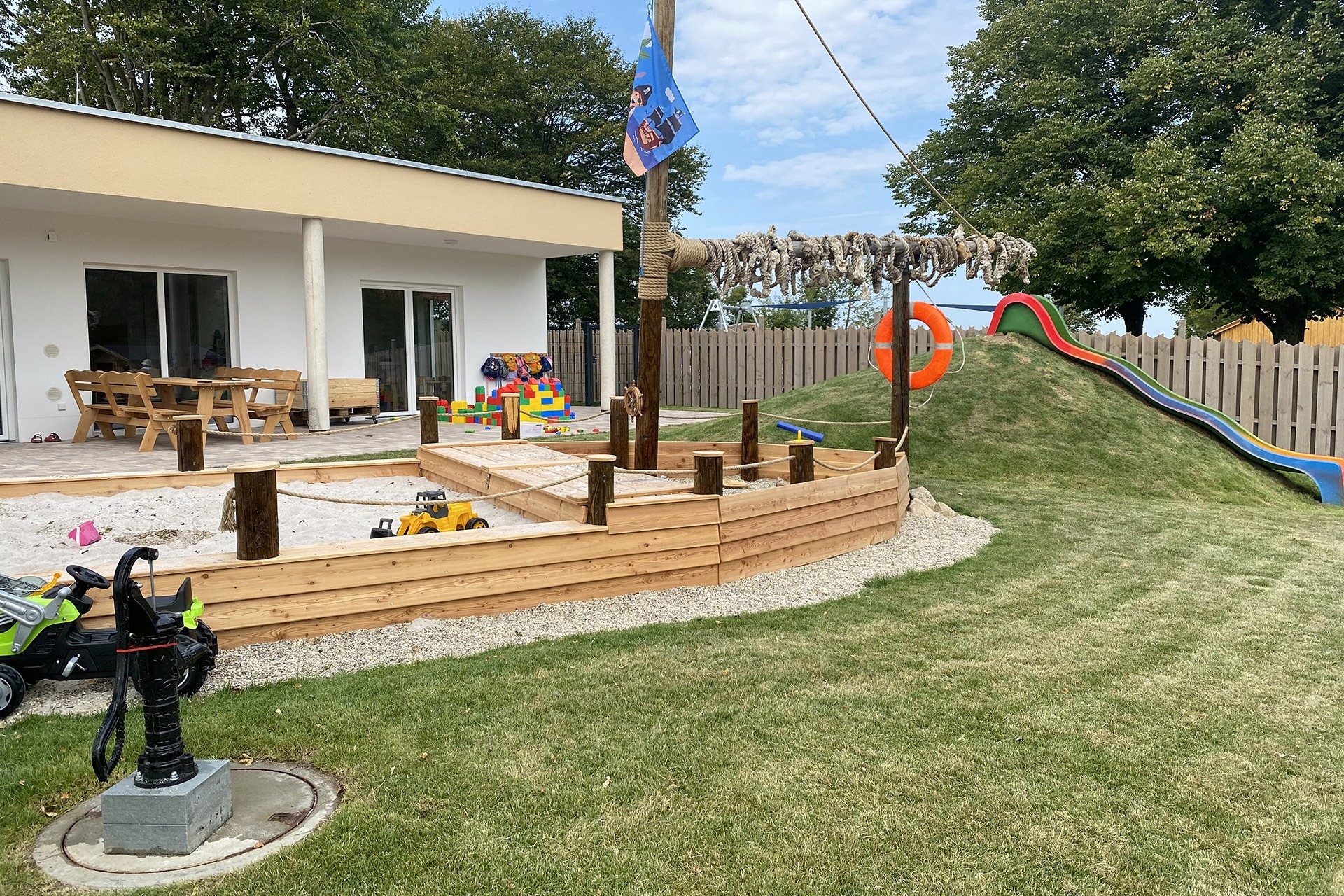 - Schlüsselfertig mit kompletter Innenausstattung mit Spielplatz, Spielgeräten usw.